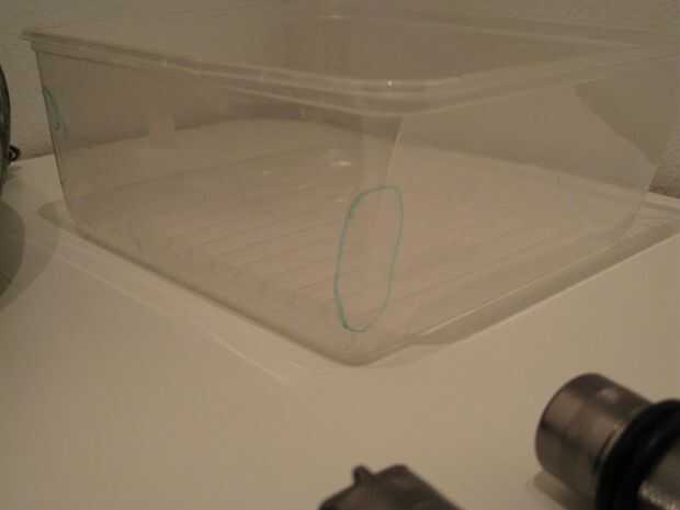 Encontrar a algún tipo de envases de plástico que es bastante robusto, aquí os muestro el uso de un envase de galletas. Uso de la marca sharpie un óvalo de tamaño adecuado a la zona de la espuma de poliestireno que desea proteger. Luego, utilizando unas tijeras, cortadas el óvalo hacia fuera (ver foto 2).