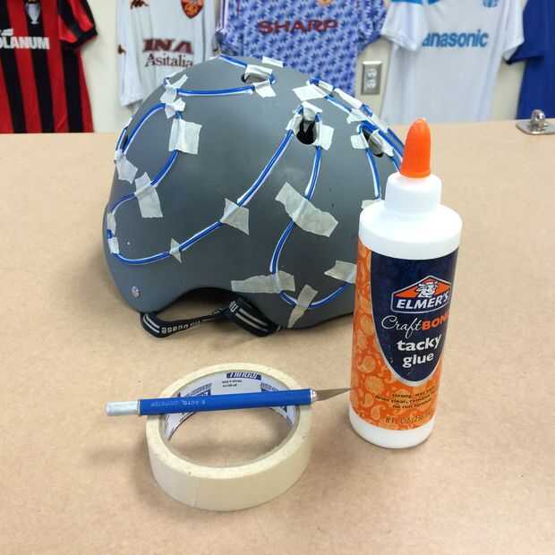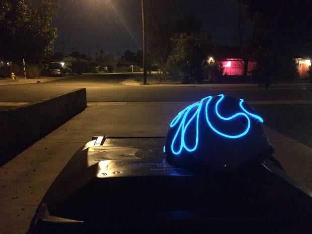 1. Monto mi bicicleta mucho por la noche en una ciudad orientada muy coche, así que necesitaba encontrar una manera para asegurarse de que yo me visto por la noche. Utilizando EL alambre, cinta scotch, Elmers pegamento y una pistola de pegamento caliente (no fotografiada) surgió una forma barata de añadir iluminación a un casco de bicicleta. Es simple y fácil, y creo que estarás de acuerdo que parece bastante dulce por la noche.