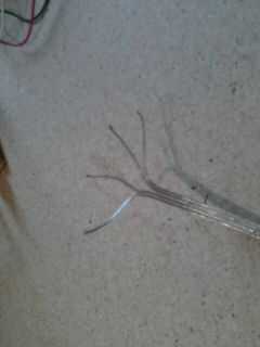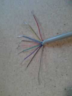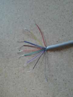 Corte el Figura-8 cable Serial en cuatro partes de igual longitud. Tira de 4 pulgadas desde el extremo de cada pieza, revelando los 8 cables dentro. También habrá algunos cable libre y envoltura metálica interior--usted puede cortarlos. Cerca de 1 pulgada de cada cable de color, revelando el raws hilos metálicos dentro de la tira.