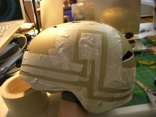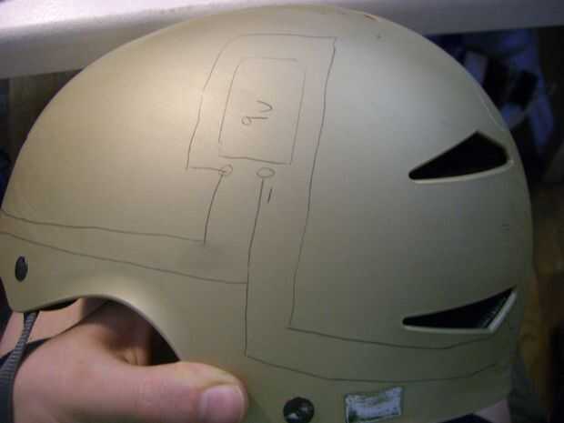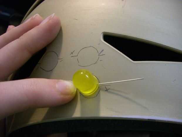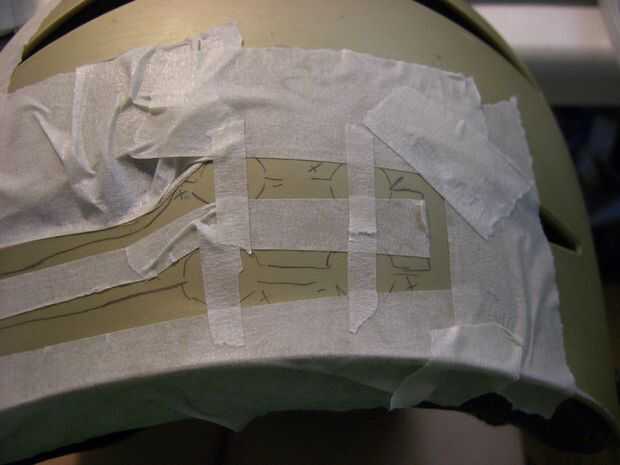 Utilizando un lápiz, dibuje el circuito directamente en el casco. Sostenga los componentes (LEDs, batería) derecha y traza a su alrededor. Positivos y negativos para la actual dirección de la marca. Con cinta de enmascarar, máscara de la zona que no Haz pintado. Use la uña para realmente obtener un sello hermético cerca de donde irá la pintura.