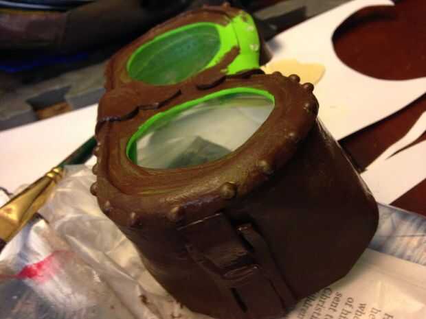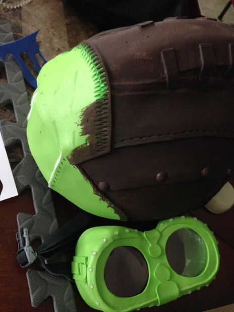 OK, me olvide de tomar una foto del casco de moto original antes casé, así que uno después de todo fue hecho, por lo que se puede ver que en efecto es un casco de bicicleta en el interior. Para empezar, usar cualquier casco de moto que le gustaría. Me acabo de comprar uno de Walmart. Siguiente conseguir un manojo de hojas de espuma de oficio, así como un garaje piso 1/2 espuma EVA... Usted puede recoger esto en Lowes o Home Depot y un montón de hojas de afeitar. La cantidad dependerá de cuánto detalle desea poner en su casco de bicicleta. La espuma más gruesa no es difícil de cortar, pero las hojas van sordas muy rápidamente, así que voy pasando como muchos. Obviamente este tipo de cosas no viene con un patrón, así que tuve que hacer mi propia. Todo que hizo fue diario de laico en el casco y sacar las tiras que quería usar y les grabó en lugar así que sabía si emparejan para arriba. Luego transferir el periódico "patrón" en la espuma del arte... mi espuma era verde brillante. Usé el verde para la mayoría del casco. Utilizado la espuma más gruesa para crear el media tira levantada. Esto tomó un tiempo para alinear y hacer los bordes incluso. Después de cortar todas las piezas de espuma, usted apenas caliente pegarlos en el casco. Superposición de los bordes está bien porque agrega al efecto al final. Nada que no se alinean correctamente, usted puede llenar los vacíos con la masilla de secado rápido. Sólo exprimir algunos sobre su dedo y limpiar dentro de los orificios para suavizar los bordes. Sólo asegúrese de que es suave porque te seca así... y es bastante rápido. Para las gafas, compré unos anteojos baratos de protección y cubrió la misma manera con las tiras de espuma que era caliente pegado en su lugar. Remonta la cosa entera en la espuma para ayudar a asegurarse de que es el tamaño correcto. Para los "pernos" sólo añade una fina tira de espuma alrededor del borde y luego le agregan gotas de pegamento caliente espaciadas y deje secar. Después la espuma cubría el casco, tengo un soldador y quemó todos los orificios y detalles en la espuma. Asegúrese de hacer esto con un ventilador que sopla o hacerlo fuera, porque los gases son fuerte y muy probablemente no bueno para usted! Luego si tienes una pistola de calor, ligeramente dirigir la pistola encima de la sección de espuma completo para "sellar" la espuma. Si no tienes uno, sólo tiene que utilizar una capa de Aguado pegamento de elmer... realmente algunas capas y deje seco entre las capas. Yo sugeriría conseguir una pistola de calor aunque. Es mucho más rápido y funciona muy bien. :) Lo ayudaremos a crear la textura "coriácea" para más adelante también. Después de todo el trabajo de sellado y el detalle, cubrió con una capa de pintura marrón.