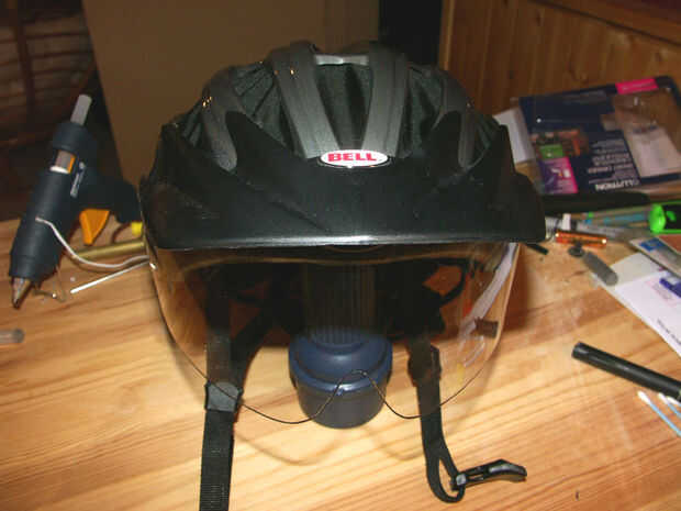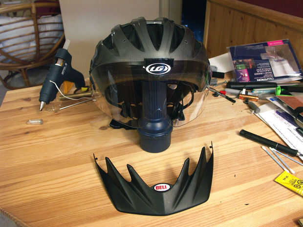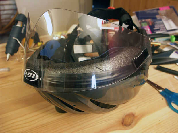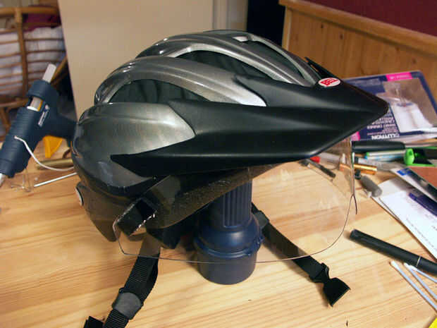 Ya que estoy acostumbrado la careta comprados no tengo construir fotos te ayudarán a hacer su propio, pero usted debe ser capaz de descubrirlo. Podría hackear una visera diseñada para uso industrial, corte una pieza de embalaje o tal vez incluso utilizar una botella de refresco de plástico. La careta se envuelve todo el camino alrededor de la parte delantera del casco de oreja a oreja. También se extiende hacia abajo para proteger parte de las mejillas del jinete. Se conecta a través de una tira de velcro que corre a lo largo de la parte superior del escudo. El velcro permite quitar el escudo cuando no es necesario.