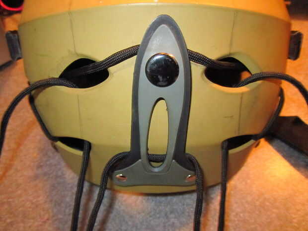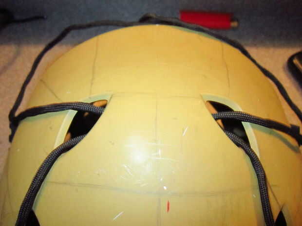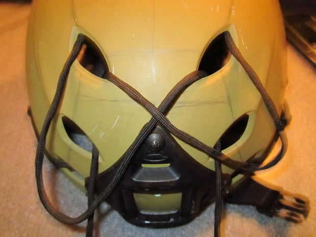 Primero, empecé por la parte posterior una vez más, doblando el cable por la mitad para asegurarse de que ambos lados estaban aún. Luego rosca el cable a través de los orificios de la parte inferior trasera, y hasta el acompañamiento de los agujeros por encima envolviendo la cuerda alrededor de la primera envoltura. Luego había roscado el cordón por los agujeros trasero en la parte superior del casco, forma que atraviesan dentro del casco. (Foto 1 y 2)
