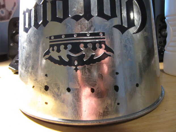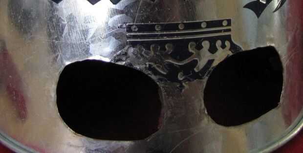 Ahora usted toma tus tijeras y recorta los agujeros del ojo. Esto puede tomar un poco y puede ser un poco irregular pero una vez que tienes la forma inicial puede alisar hacia fuera con las tijeras para latas y que con la Lima de metal.