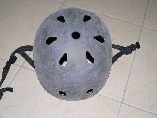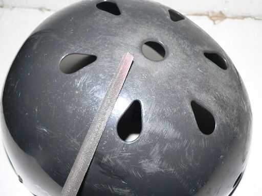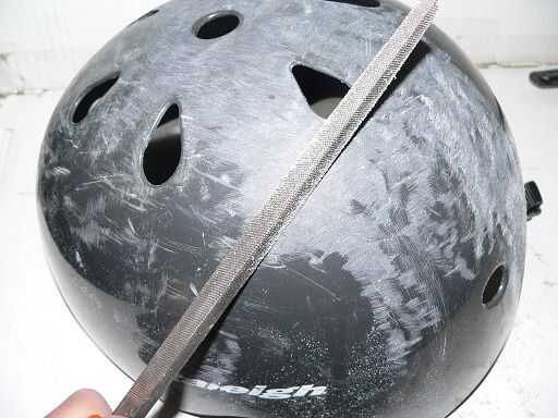 Antes de comenzar, si es posible, retirar el interior del casco para que la pintura no disuelve. Usando el archivo o papel de lija, ir sobre el casco, así que usted puede quitar su superficie lisa y pulida. Esto permitirá que la pintura permanezca en el casco en vez de él roce. Se vería algo como la imagen 3.