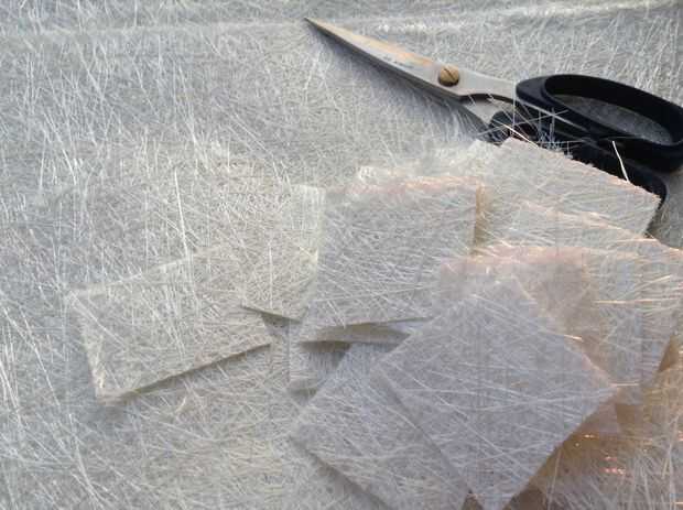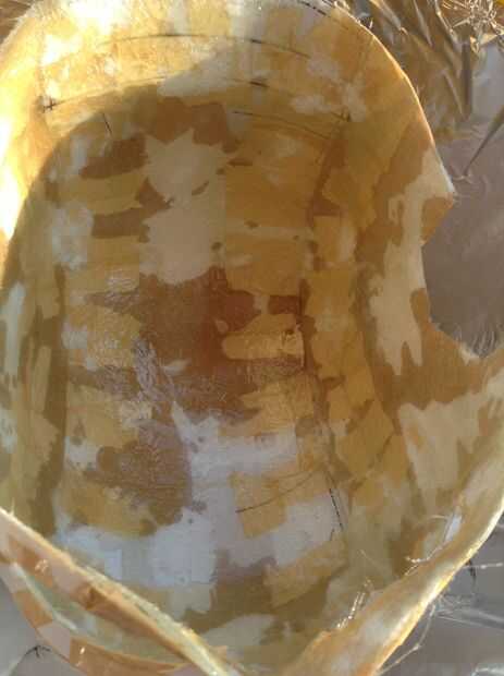Ahora cuando todo está seco, voltee el casco. Cortar unos pedazos de alfombra de fibra de vidrio, tal vez 2x2inches. Pincel pegamento, o si tienes pegamento de spray, spray en el interior del casco a continuación cubrir con estera de fibra de vidrio. Una vez más, asegúrese de que no dejar ninguna parte sin mat.