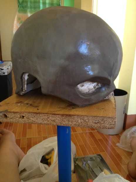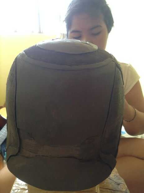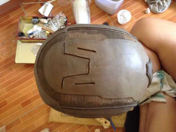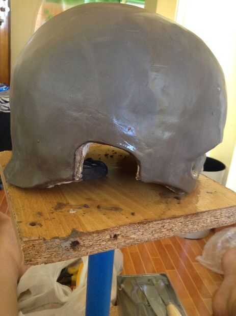 En mi caso, comencé por acodar el casco con la arcilla y suavizar las cosas y poniendo en las formas básicas, intentar cubrir con más de 1cm de arcilla o de lo contrario serían más propensos a agrietarse. Como usted sculpting tan rocíe un poco de agua cada ahora y después para que no seque aún.
