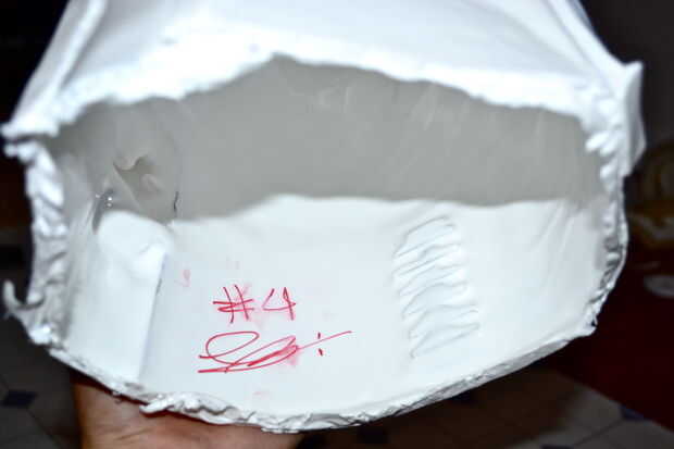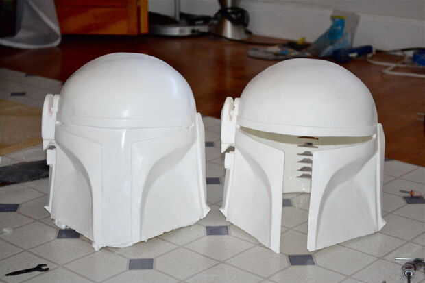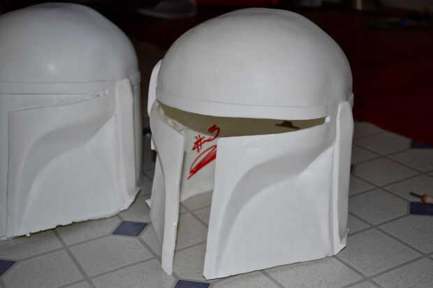 Cuando se curan las cuatro capas, quitar la cáscara exterior, quitar la chaqueta de silicona y ahora tienes un casco de Mandolorian!