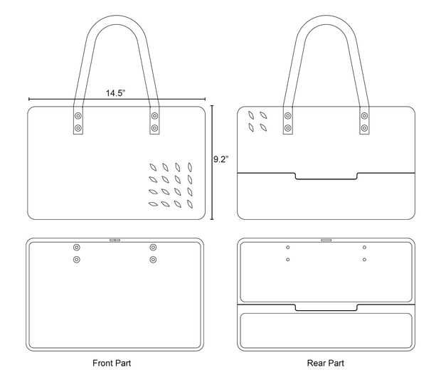 El cuerpo de madera de esta bolsa consta de dos partes: delantera y trasera. Cada parte es 14.5" ancho, alto, de 9,2" y 0,80" en profundidad y a ser tallado de una 17" ancho, 10.5" de alto y 0,825" profunda madera losa por la máquina CNC (Shopbot Buddy) basada en los dibujos a continuación. Para exhibir dos maderas diferentes, 4 hojas y 16 hojas fueron polar ataviado con un gradiente rotacional gradualmente cambio en ambas partes respectivamente. Diseñé y dibujó en AutoCAD.