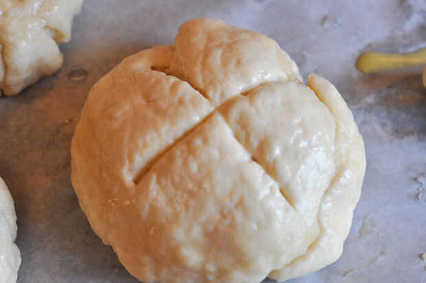 Las bolas de masa de la gota en el agua hirviendo dos a la vez y permiten puff 1-2 minutos antes de sacar la bandeja para hornear. Con un cuchillo, marcar la parte superior de los bollos. (X los bollos de hamburguesa, / el pan de perro caliente)