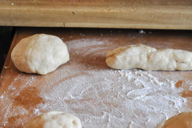 Separar la masa en cuatro bolas. Forma en pan redondo de hamburguesa o perrito caliente en forma de registro bollos dependiendo de su opción de cena.