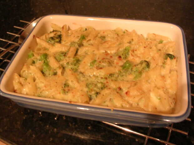 3. Escurra la pasta y el brócoli, rocíelas con la salsa blanca y mezclar bien. Vierta en una fuente para horno, con el resto del queso y poner en una parrilla caliente hasta agradable y gratinado.