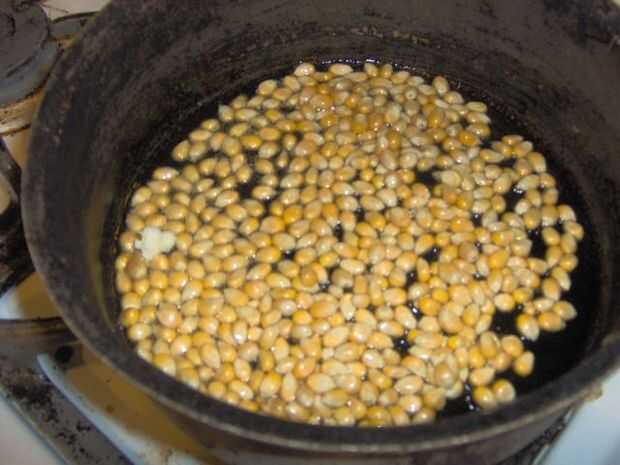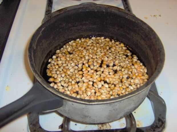 A continuación, vierta las palomitas de maíz en la sartén. Como el aceite, poner suficiente en hasta que cubra la parte inferior. Cubrir la bandeja y encienda el calor alto.