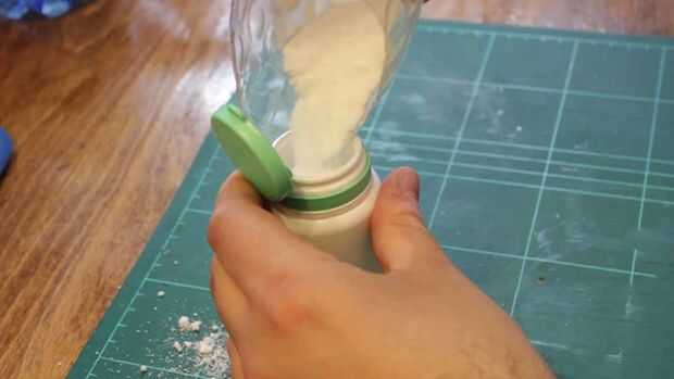 Una vez que la mezcla se preparó, lo pongo lejos en algunos recipientes de plástico para su uso posterior. Se puede ver cómo con gas la mezcla es cuando se mezcla con agua y activa.