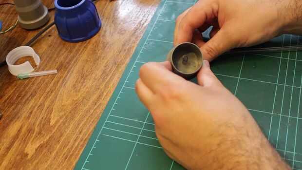 Taladré un agujero de 6mm en el tapón para que puedo insertar unos tubos de plástico. Con el agujero perforado, me inserta el tubo y fijar algunas epoxi 10 minutos.