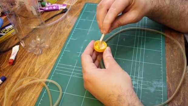 Con un agujero de 4mm perforado en la tapa, he insertado algunos tubos de silicona de acuario que tiene una válvula unida a un extremo. También llena los alrededores con una mezcla de epoxy líquido y establecer durante la noche.