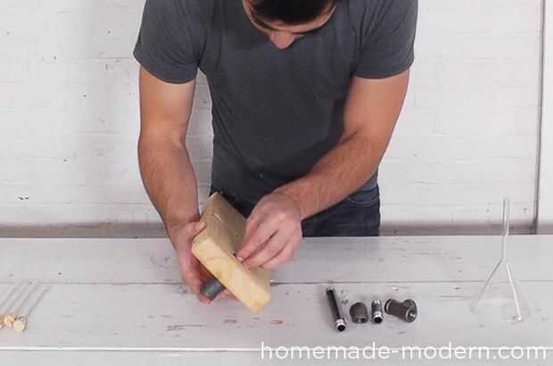 he utilizado las 2 contratuercas y 1.5" pedazo largo de la tubería a la abrazadera en el 2 x 6. Se adapta a la tubería de diámetro de 3/8" a través del orificio de diámetro de 3/4" y luego una tuerca en cada lado asegura el tubo a la madera. El agujero grande 1 1/2" de diámetro en la parte inferior de la Junta esconde la tuerca inferior.