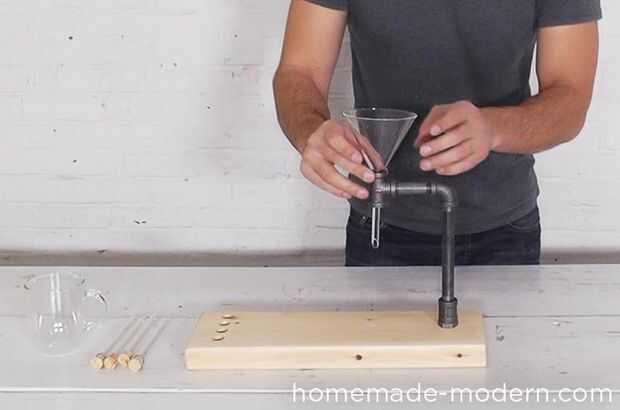 Inserte el embudo de vidrio en la tapa T-fitting y listo agregar un filtro, café molido y agua caliente! Utiliza filtros de Chemex, pero accidentalmente compró los grandes, así que tuve que usar tijeras para cortar a su tamaño.