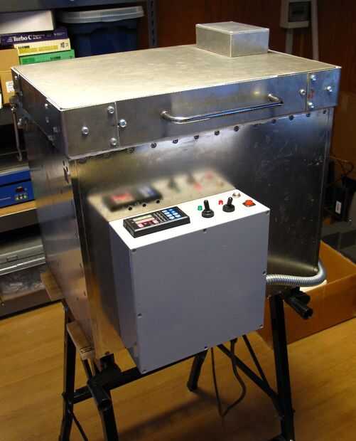 El primer número era un recinto - por suerte esto fue solucionado por mi trabajo. Ha vertido un recinto de prueba de radio de aluminio grande que parecía perfecto. El recinto ya tenía una caja de control de aluminio en el lado y era generalmente muy robusto. El recinto no tenía una tapa pero si no fue buena. Hice algunos leyendo alrededor y decidió calentar el horno desde la parte superior, esto le da al vidrio un mejor acabado de brillo. Así que sabía desde el primer día que iba a tener que fabricar una tapa superior con sistema de calefacción integrado. Para fundir vidrio necesita una temperatura constante de alrededor de 800C y aluminio se funde a unos 660C - así que existió un pequeño problema. El recinto iba a estar muy bien aislados y para ello que utilicé una combinación de ladrillo de fuego cerámica, manta cerámica y pegamento de alta temperatura. Para fundir vidrio simplemente no encienda el calor completo y sentarse. Tienes que subir la temperatura lentamente y más importante reducen la temperatura lentamente para evitar el choque térmico del vidrio. Para controlar este proceso he usado una 410 de PC Altec controlador de temperatura industrial de multi-programa multi-step conectado a un termopar de tipo K.