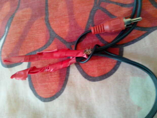 primero se corta el cable AV y tiras de la cubierta de pvc. Ahora conecte a la toma audio y soldar la parte desnuda y cubrirla con cinta aislante o eludir tubo.