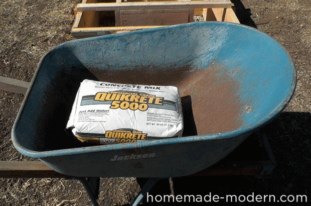 empecé con un 3.5" pour profundo de hormigón que serviría como la Fundación del hoyo de fuego. He mezclado el 5000 de Quikrete en una carretilla y pala en su lugar. Alquiler de una mezcladora habría hecho esto mucho más fácil, pero me gustó el ejercicio. Que el concreto cure por lo menos 20 horas antes de colocar el ladrillo.