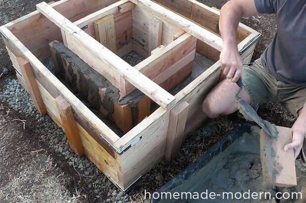 Una vez que el concreto haya curado un mínimo de 20 horas, prepárese colocar el ladrillo de fuego. Había mezclado el mortero según las instrucciones en la bolsa de arcilla de mortero. Comencé con una base gruesa de mortero de aproximadamente 1/2" alrededor del perímetro interior de los encofrados y colocan los ladrillos uno a uno. Extender mortero en el lado de los ladrillos antes de colocarlos para que se peguen juntos.