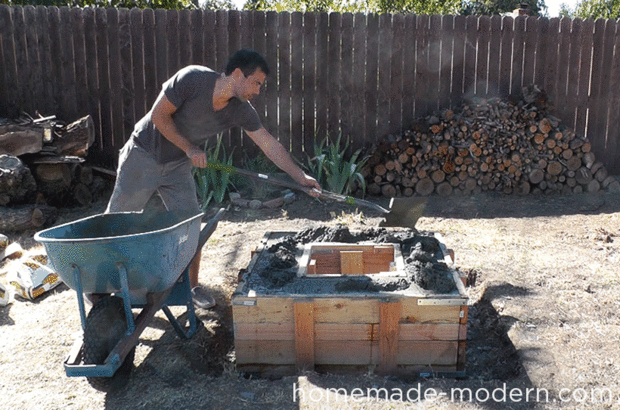 Después de dejar que la capa anterior de la curación concreta cerca de 20 horas, derramé la capa final de hormigón. Usé una azada para empujar el hormigón en todas las esquinas y una clavija de madera para vibrar el hormigón con la mano.