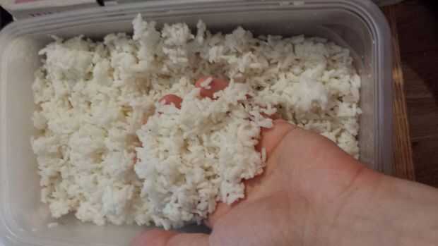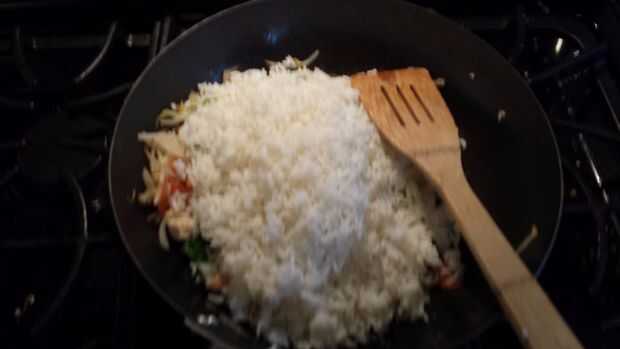 Las cosas están avanzando rápidamente. En este punto el arroz debe ser roto por lo que hay no hay matas de arroz. He encontrado la forma más sencilla de hacerlo es a mano. Una vez que la carne ha sido calentada y mezclado con las verduras, es hora de añadir el arroz. Simplemente tirar unas cuantas tazas de arroz blanco en la carne y verduras.