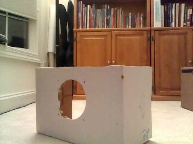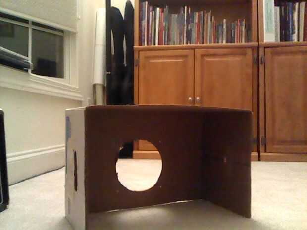 En este paso, se corta un agujero en su caja con su navaja. Asegúrese de que el agujero ajusta el ventilador para que la mitad de su ventilador puede caber en este agujero. Asegúrese de dejar espacio para los agujeros de montaje de su ventilador para que puede atornillar el ventilador. Además, corte el lado opuesto de su agujero del ventilador y el lado que será la parte inferior de la estación de soldadura.