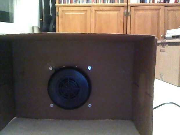 Lo que haces es Coloque el ventilador en la caja con los agujeros alineados con los agujeros que hiciste. Asegúrese de probar el ventilador para asegurarse de que está siendo aspirado el aire desde el interior de la caja.