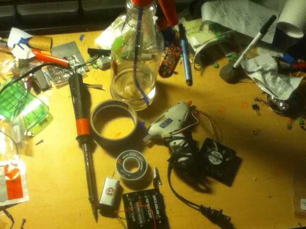 Se necesita: un atomizador grande (utilicé un 32 oz botella) una batería de 9v con 4 pilas AA con soporte soldador con estaño, pinza, algún alambre, pistola de pegamento caliente, pegamento caliente, clip PC enfriamiento ventilador de una Motherboard, Tarjeta madre, cinta (cinta adhesiva o cinta adhesiva), cortadores de alambre y strippers y pintura en aerosol si lo desea.