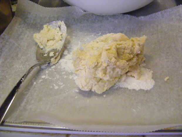 Doble y presione. Recoger pedacitos sueltos y doblar en la bola. Continuar haciendo esto hasta que toda la harina floja se incorpora.