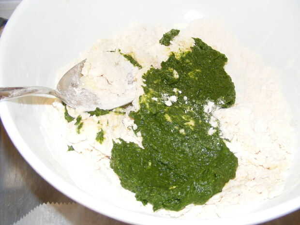 Mezclar hasta llegar a unos buenos trozos de masa y los huevos han congelados en pedazos. Ahora puede añadir unas gotas más de agua para incorporar toda la harina suelta globos semisecos que parecen migas de goma gigante. Ahora está listo para formar una bola.