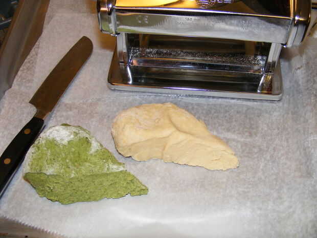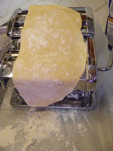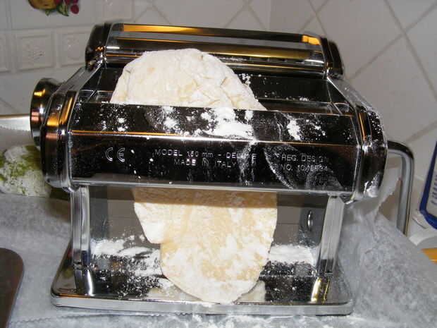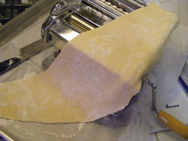 Luego, ajuste los rodillos en una posición más alta que disminuye el grosor de la pasta. Encontrar su preferencia con cómo gruesa te gusta la pasta. Contine a estirar la masa de pasta. La pieza de pasta obtiene más disminuir el espesor. Cada pedazo de polvo como sea necesario para que no se pegue. Puede colocar las piezas de laminado o colgar en un taco limpio suspendido entre dos sillas.