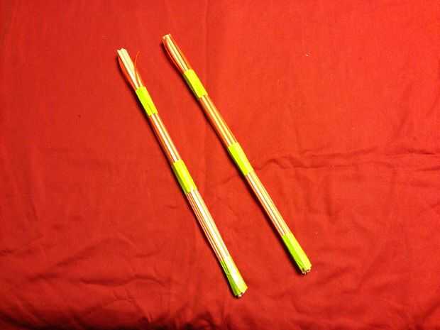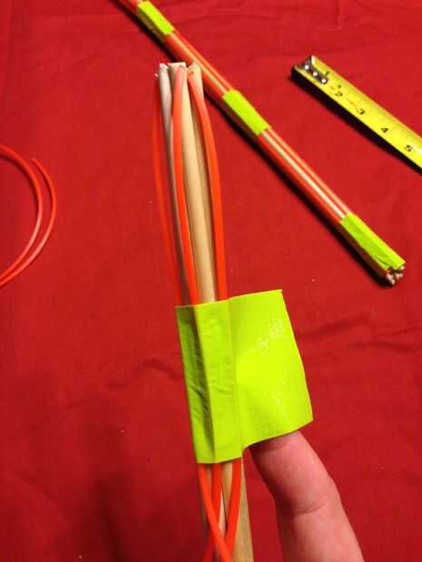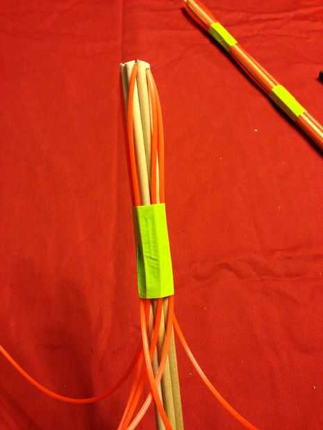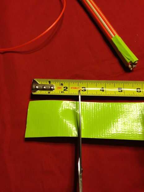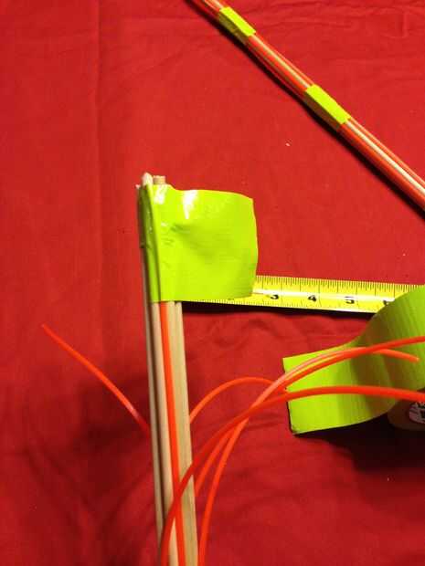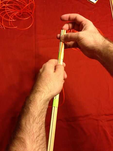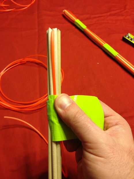 Cortar un trozo de cinta de 2,5 pulgadas. Entonces, comenzando en la parte superior del palillo, agregar una de las piezas de segadora línea entre el exterior de dos de las varillas y pegarlo sobre la pieza topmost de cinta externa (para mejores resultados, trate de hacer la curva en la línea del condensador de ajuste hacia el centro del palo). A continuación, tome la nueva longitud de la cinta y conecte un lado de él con el palo, cubriendo completamente el ancho de la cinta adhesiva y envolver la línea trimmer, pero dejando sobre todo sin envolver. Agregue la siguiente pieza de línea trimmer, comenzando en la parte superior y envuélvalo con la cinta externa. Manteniendo la cinta exterior ajustado, continuar el proceso hasta que haya seis piezas de trimmer línea alrededor de la palanca. Iniciará el mismo proceso a medio camino abajo de la palanca y otra vez en la parte inferior. Esta línea del condensador de ajuste puede ser un dolor para trabajar con, pero hará lo que usted quiere a :)