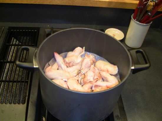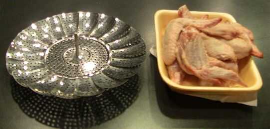 Un paso que suele pasarse por alto es cocer al vapor las alitas antes de hornear. Debido al alto contenido de grasa de alitas de pollo, hornear a menudo puede causar su horno producir grandes cantidades de humo. Al vapor las alitas de pollo antes de cocinarla, gran parte de la grasa puede eliminarse dando por resultado menos humo al cocinar al horno. Otro añadido beneficio de hacer esto es una comida más saludable. En primer lugar, coloque las alas y muslos en la bandeja de vapor vegetal. A continuación, llena tu olla grande con aproximadamente 1 pulgada de agua. Poner el agua a hervir y con cuidado coloque la rejilla de vapor en la olla. Cubrir con una tapa y deje las alas al vapor por aproximadamente 10 minutos. Tenga cuidado al quitar la tapa para evitar quemarse por cualquier vapor (mantenga su cara lejos de la olla). Quitar las alas de la olla y coloque en el refrigerador durante unos 15 minutos permitir que se enfríen. Pasemos al siguiente paso mientras el frío de las alas.