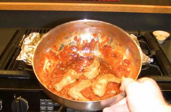 Sacar sus alas del horno y use una espátula para separar las alas de la lámina. Coloque tres o cuatro alas en su recipiente grande que contiene la salsa y mezcle con un tenedor para cubrir completamente las alas. Repita este paso hasta que todos tus alas son cubiertas en salsa.