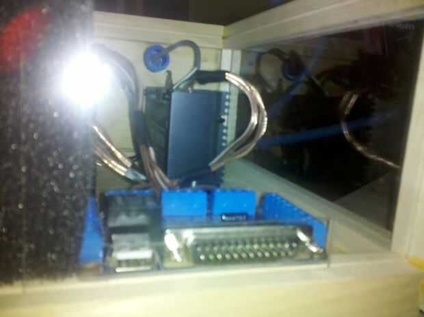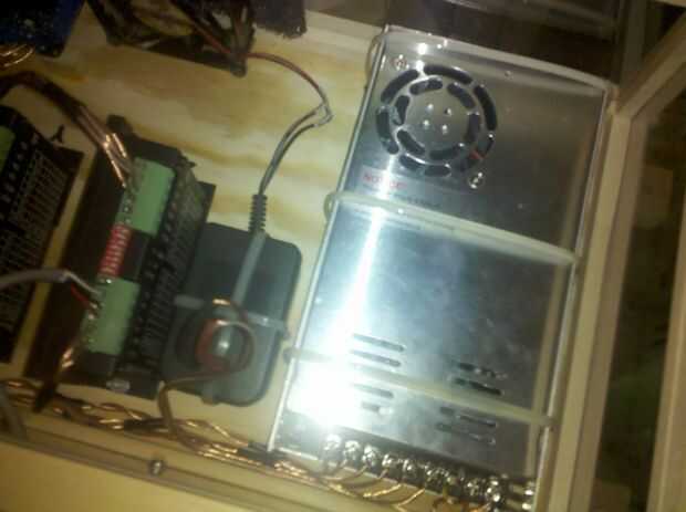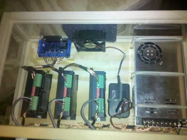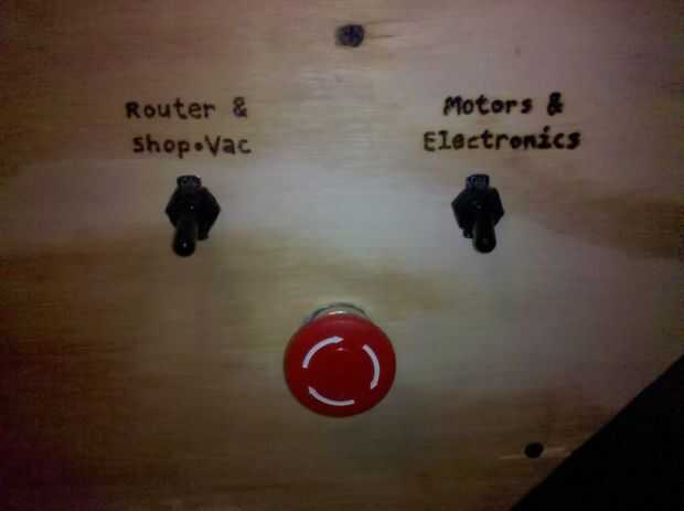 I cableado toda la electrónica y añadido algunas características más como un interruptor de parada de emergencia, interruptores e interruptores de potencia para el router, shop vac, electrónica y los motores de escalonamiento.