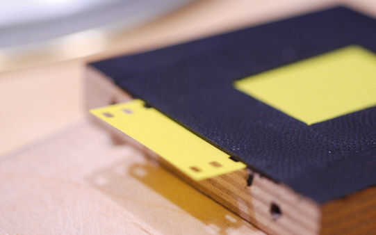 6 de la imagen: Obturador de cortina/visor, que es hecha del mismo plástico fino utilizado en el plano de la película. La pieza delgada de madera encolada (epoxi) en la parte inferior tiene dos propósitos, lo más importante me impide tirar de la cortinilla de la cámara al tomar una foto, y también para la persiana en la posición de abierto tan pronto como la ventana de la película se destapa para evitar cualquier viaje innecesario. Esto es importante porque en algunos casos querrá abrir y cerrar el obturador lo más rápido posible. Pongo un poco de parafina en las ranuras para ayudar a hacer la diapositiva de obturación lisa y operar sin ningún enlace, lo que ayuda a evitar sacudidas de la cámara.