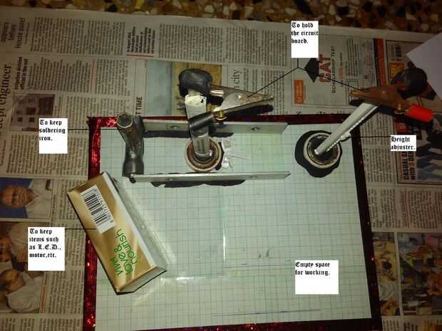 Hola, este es un muy barato mano de partículas de basura de casa. Apenas costaría $1,5 para hacerlo. En esta ayuda te puede ajustar la altura y la distancia entre las 2 manos. Un cuadro también está presente para mantener artículos como diodo emisor de luz, motor, resistencia, etc.. Un soporte también está presente para mantener el soldador. Se proporciona un espacio libre para llevar a cabo el trabajo.