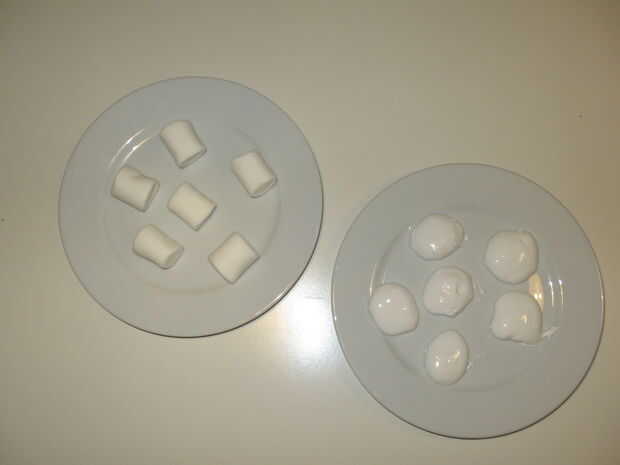 Ponga las melcochas y la pelusa de la melcocha en una placa y trató de formar la pelusa en bollos pequeños. Realmente no funcionó, así que se convirtieron en clase de planos!