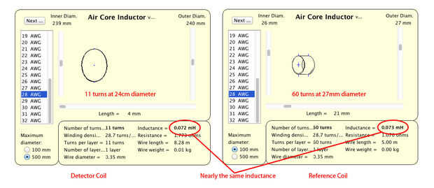 5.) mientras que utiliza la dirección del simulador de inductor de coilgun.info en http://www.coilgun.info/mark2/inductorsim.htm para determinar cuántas vueltas necesitaba en mis bobinas. Encontré que tenía que agregar vientos de cerca de 10 o más en mi bobina de referencia que el simulador dice que. Lo que realmente me sorprendió fue que pude llegar a esta solución de trabajo en gran parte por ensayo y error! Pude enrollar y desenrollar la bobina de referencia y mover el campo ajuste hacia adentro y hacia afuera hasta que encontré un lugar dulce donde trabajó.