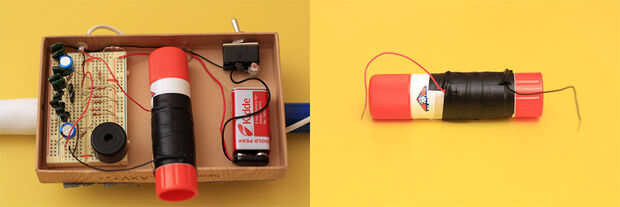 Que los vientos en el palillo del pegamento que entonces puse acerca de las pruebas de mi detector de metales. Lijar los extremos del alambre de la bobina a dos bobinas y empalmado a un cable del timbre para insertar en mi circuito de protoboard y la convirtió... Entonces conseguí... nada... simplemente... nada... PERO ENTONCES! Encontré que si saludó esta bobina de referencia alrededor muy cerca de la bobina podría conseguir mi altavoz para hacer un sonido (se inspiró para hacer esto después de ver este video). Esto fue como determiné que mi circuito electrónico fue construido correctamente, incluso cuando no tenía todavía una bobina de referencia que la inductancia de la bobina del detector. Para más prueba de mi bobina de referencia sostenía destornilladores metálicos dentro de la envoltura de palillo del pegamento, que creó tonalidades distintas, esto me aseguró mi bobina de referencia no forma lejos de la inductancia que necesitaba.
