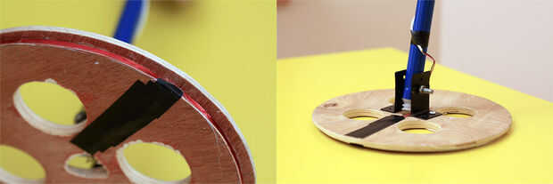 Encontré la bobina a ser la parte más fácil de construir, aunque es más trabajo. I cortar unos círculos de madera contrachapada de 1/4 de pulgada, les pegan y luego perforar algunos agujeros en los que reducir el peso. Es importante tener una forma de envolver el alambre alrededor, por lo que las dos piezas pegadas hacen una forma simple.