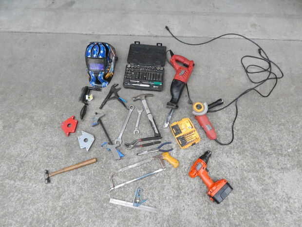 - Martillo, llaves, Plaza de soldador, abrazaderas, soporte magnético de soldadura, Socket Set, un Vise, Vise Grips y un cepillo de acero