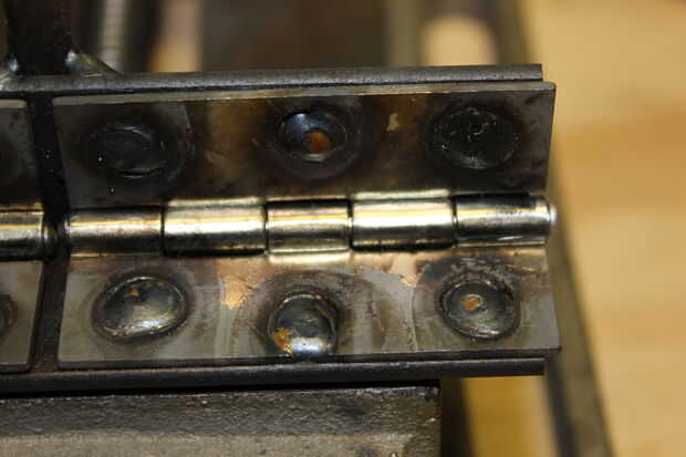 Suelte las abrazaderas de tornillo de banco y verificar que las bisagras se mueven libremente. Si todo está bien, fijarlo con la abrazadera hacia abajo y llene todos los agujeros con las soldaduras. Si se enlaza, romper las soldaduras de la tachuela, comprobar su alineación y vuelva a intentarlo.