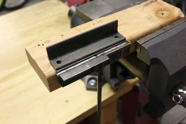 Perforar 2-1/4"---uno cerca de cada extremo de la pieza de hierro de ángulo que no tiene la manija soldada a él.