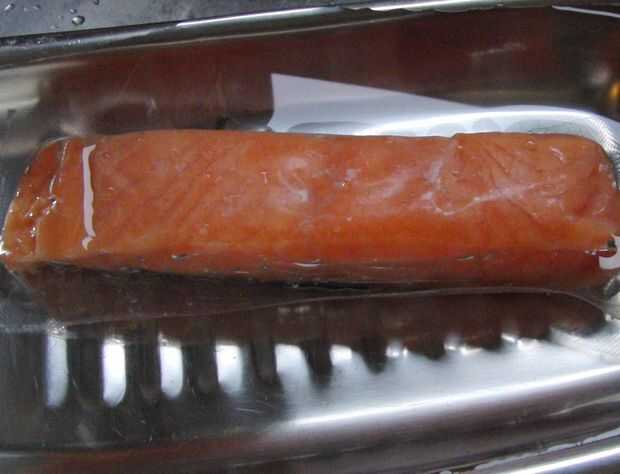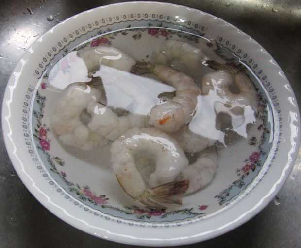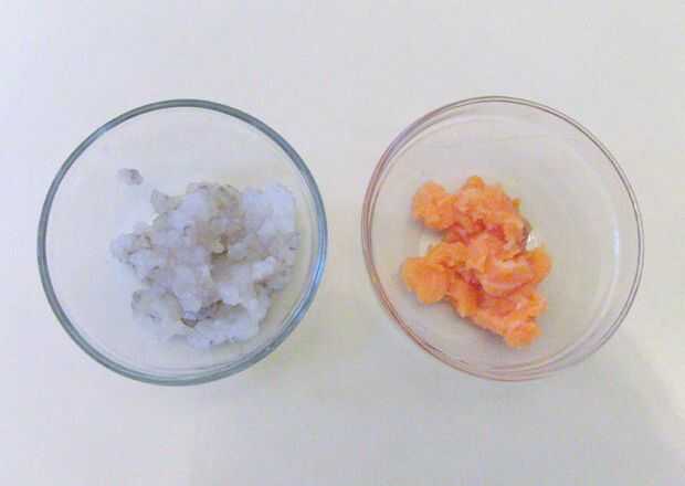 Remojar el salmón y los camarones en agua si se congela. Sólo se necesita ser empapado durante unos 5 minutos. Después, corta el salmón y camarones en pedazos minúsculos, como si fueron picar ajo. Mix junto y temporada. Sólo espolvoreado de sal y mezclar uniformemente.