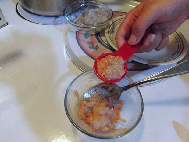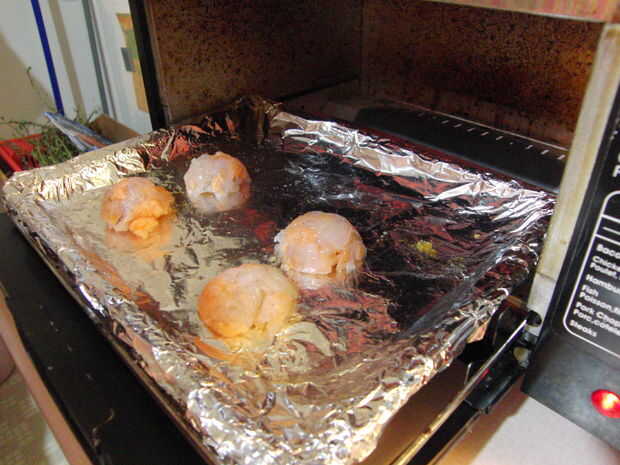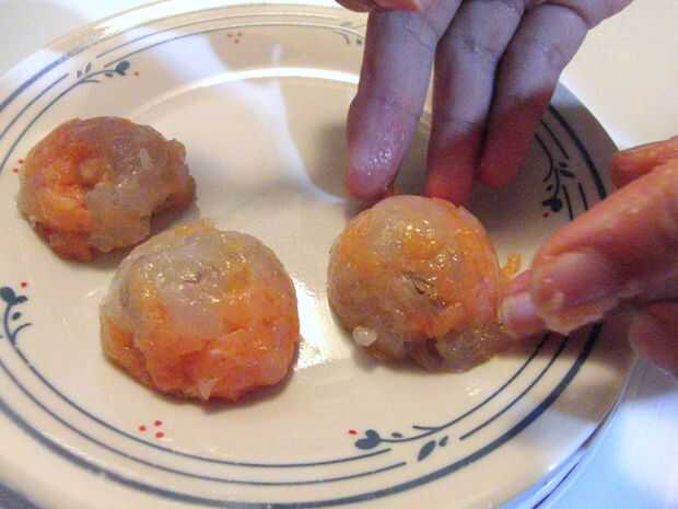 Sacar las virutas de patata cuando se hace. Precalentar el horno a 425 grados Fahrenheit. Utilice una cucharada a cucharada a la mezcla de salmón y camarón. Difundir más aceite de oliva en la bandeja para hornear y coloque cada una de las bolas de la mezcla en él.