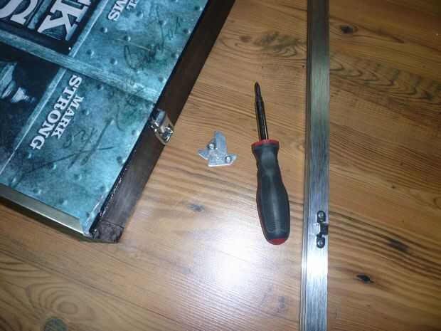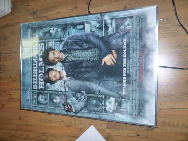 Tomar su cartel y emparedado entre las dos hojas de plástico transparente de los fotogramas de póster barato (mina pasa a ser 'Sherlock Holmes').  Aflojar la parte superior de la estructura de aluminio y Resbálelo adentro.  Tenga cuidado de no rayar nada y asegúrese de que el espejo lado pf el cartel es hacia el interior.